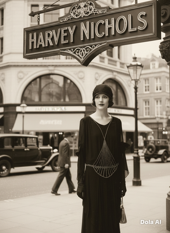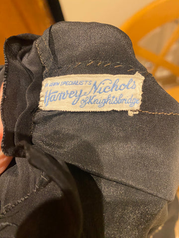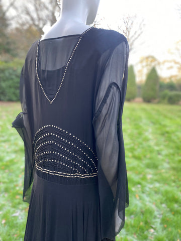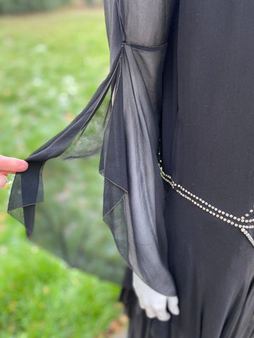 Art Deco era 1920s Harvey Nichols Black Chiffon Silk Flapper Dress with Rhinestones.