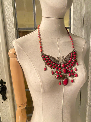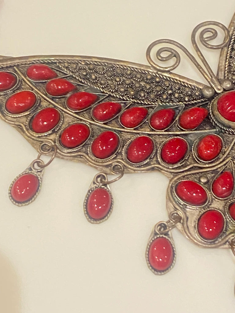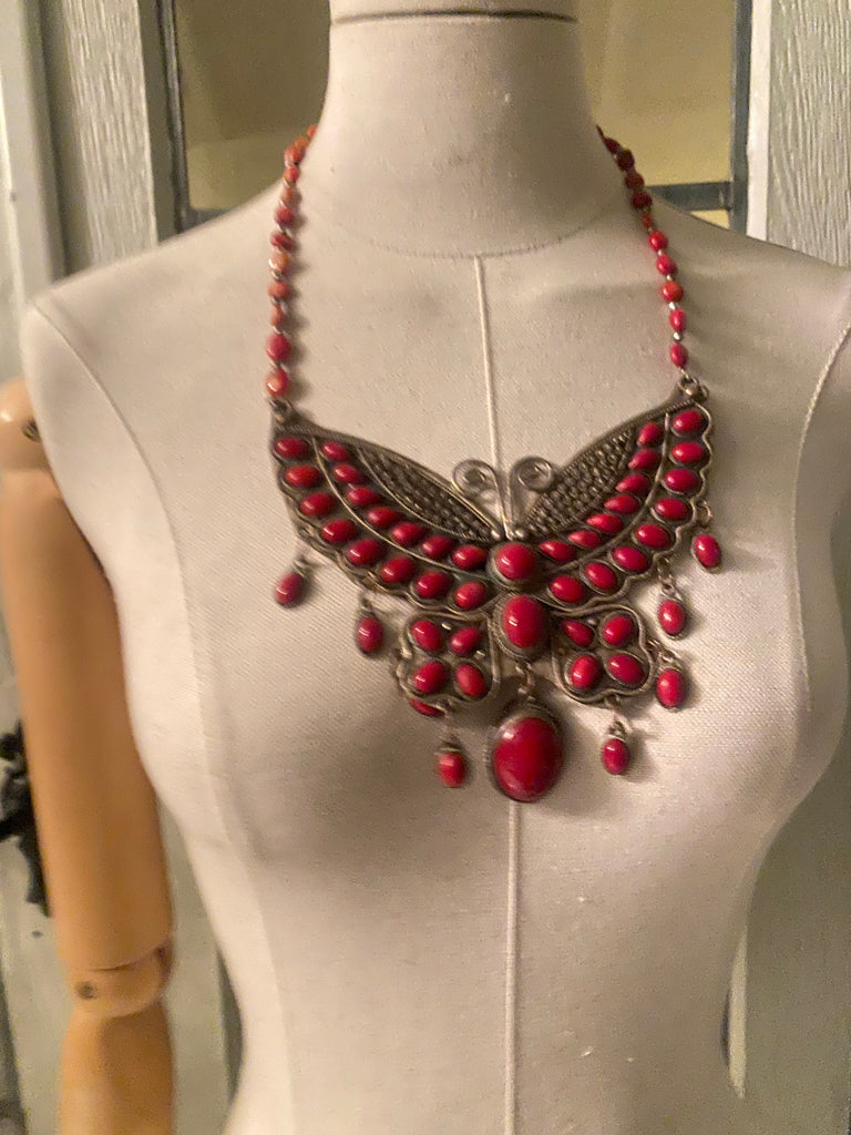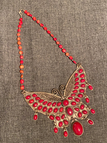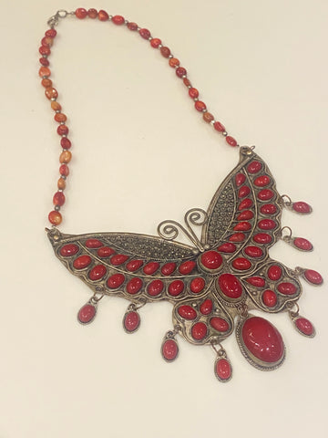 Bohemian Tibetan Red Glass Cabochon Huge Butterfly or Silkworm Necklace