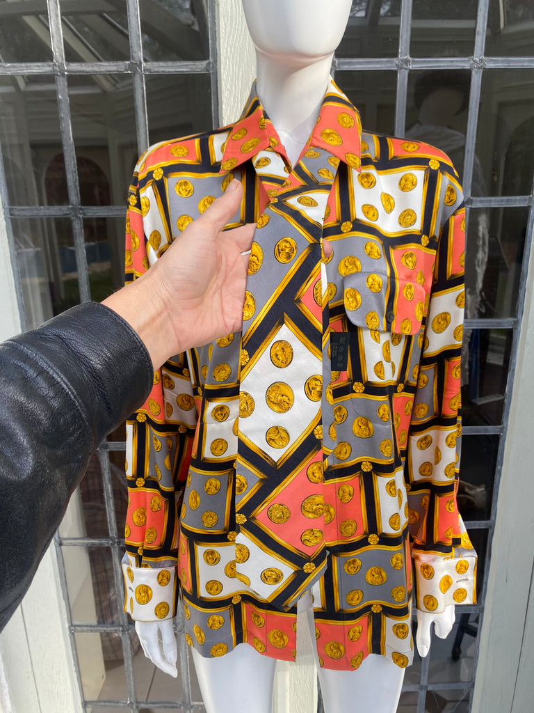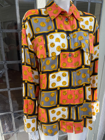 Vintage Escada by Margaretha Ley coins print silk shirt with tie.
